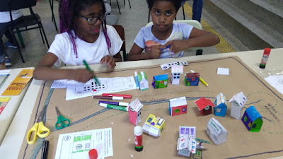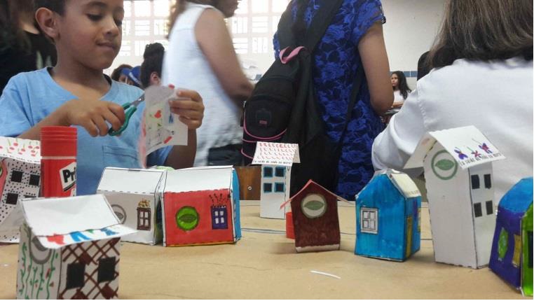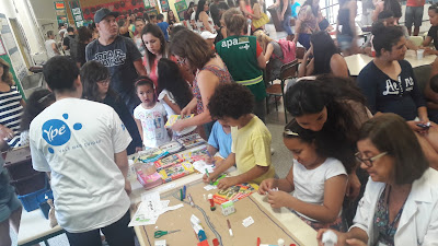 Montamos uma barraca ” Ponto de Sustentabilidade “, colocamos uma maquete onde as crianças poderiam montar as casinhas perto de um rio, porém em locais apropriados sem prejudica-lo, já que este é um recurso natural extremamente importante.
