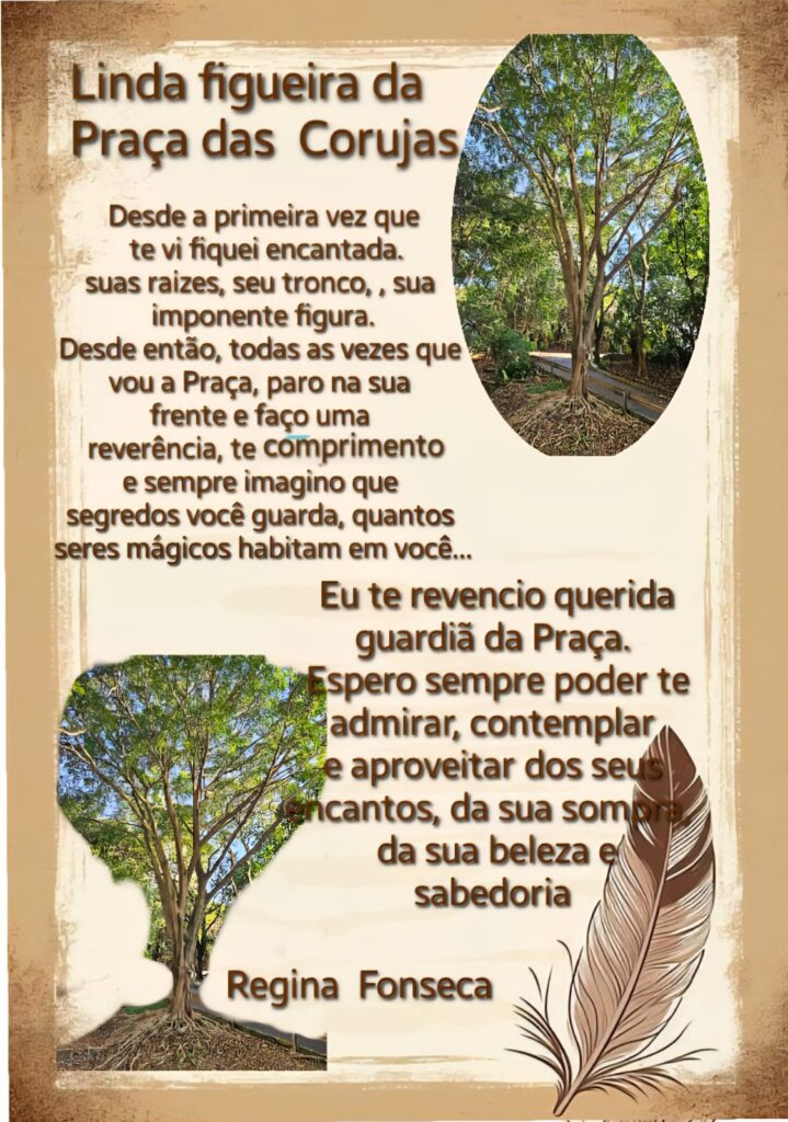 “Olá querida árvore! Até agora só você sabia que sem sua sombra nos dias de calor, sem sua alegria de folhas verdinhas e novas no começo da primavera, sem suas flores do amarelo mais vivo e brilhante que há, minha casa não seria o melhor lugar do mundo! Agora tudo mundo vai saber! E vou ficar muito feliz em receber quem quiser te conhecer para te apresentar, Dona Sibipiruna majestosa, que mora aqui conosco e nos abraça generosa. Obrigada por tudo!”